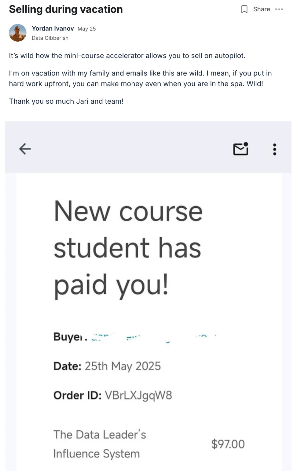 By following the steps, frameworks, and templates from Mini-Course Accelerator, Yordan built a thriving online course that’s even generating sales while he’s on vacation: