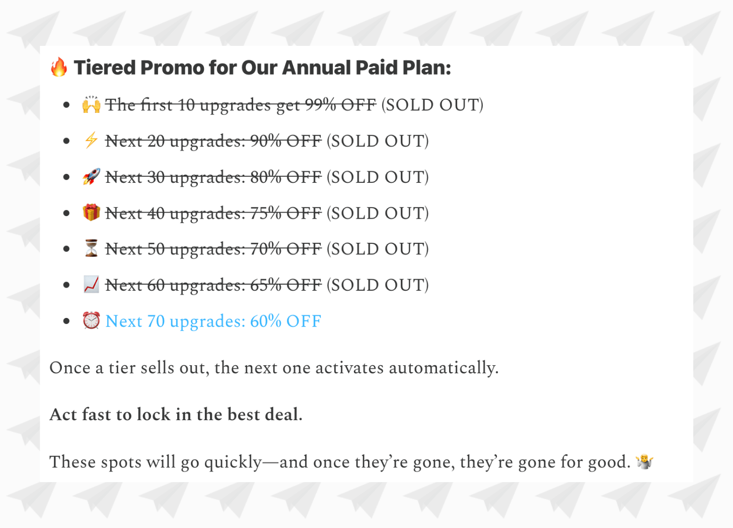 A few times a year, we run dedicated campaigns—like our 1-year anniversary promo where we offered tiered discounts for early upgraders: