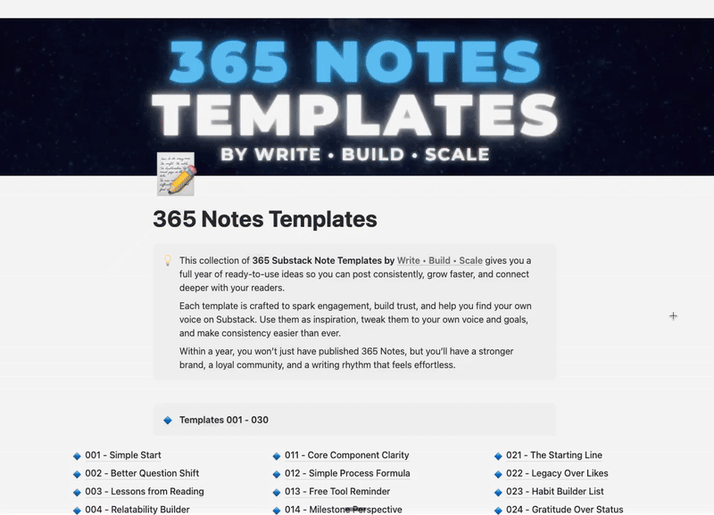 That’s exactly why we created 365 Substack Notes Templates—one for each day of the year.