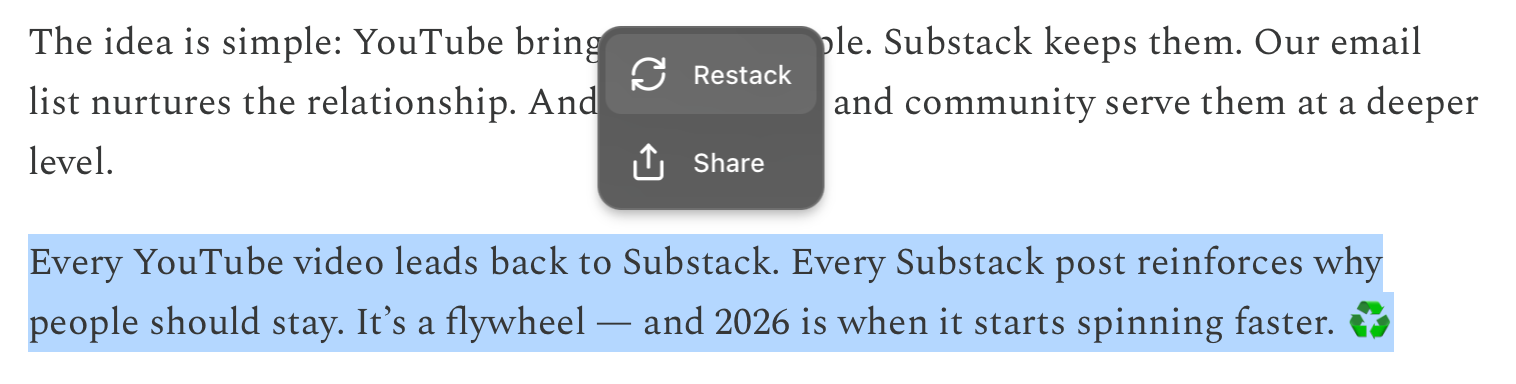 Now let me show you something really useful: If you have an existing post on your publication and you want to share a quote from it as a Note, go to that post, highlight the text you want to share, and you’ll see an option to “Restack.”