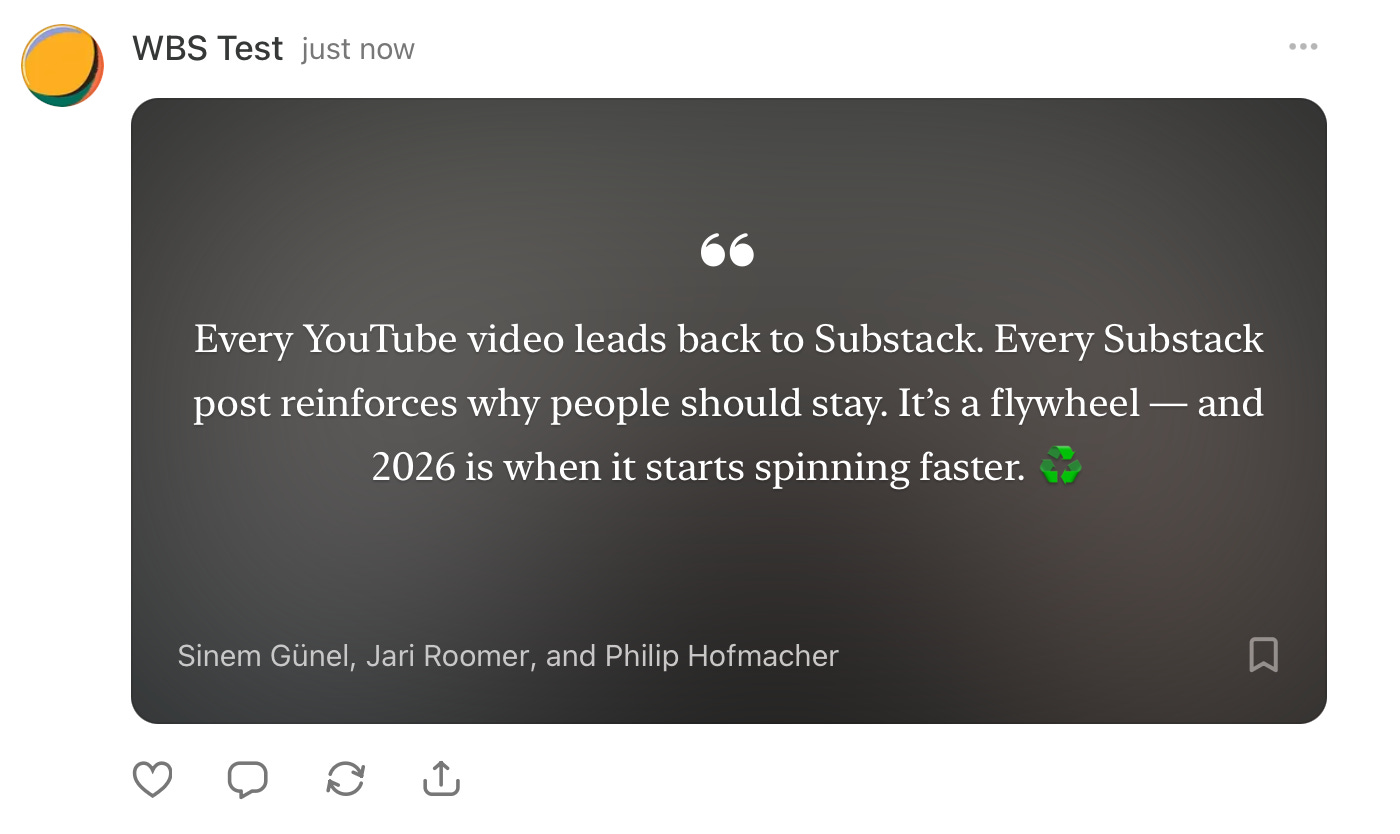 This creates a beautiful quote card with that text, and it automatically links back to your original article. It’s an incredibly easy way to repurpose your long-form content into bite-sized Notes that drive traffic back to your publication: